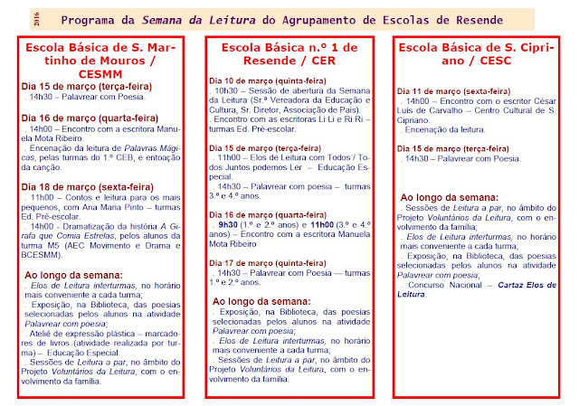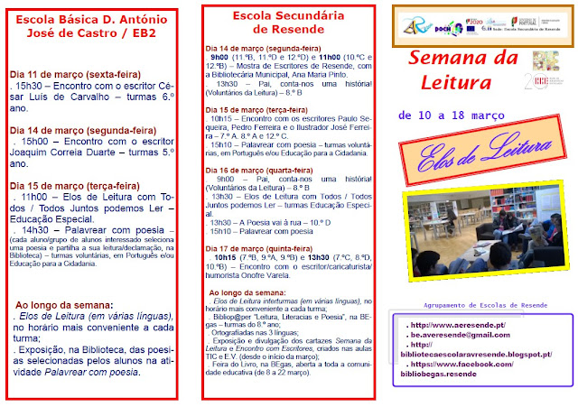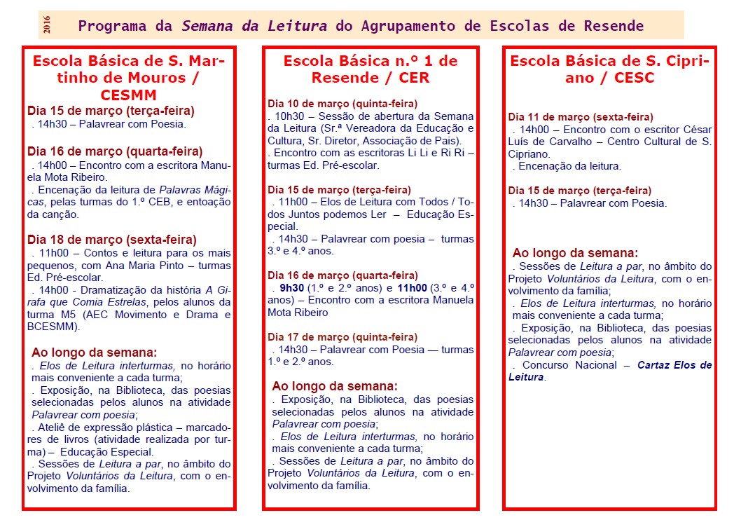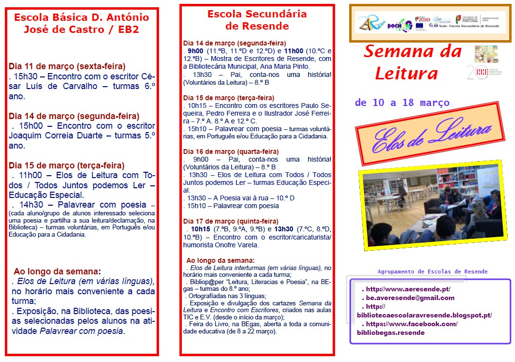 O programa decorrerá de 21 a 24 de março e de 29 de março a 1 de abril e destina-se aos alunos do pré-escolar, 1.º e 2.º ciclos, sendo que as inscrições devem realizar-se até ao dia 11 de março, nos Centros Escolares e na EB2 de Resende, de acordo com o ciclo de ensino frequentado pelos alunos.*
